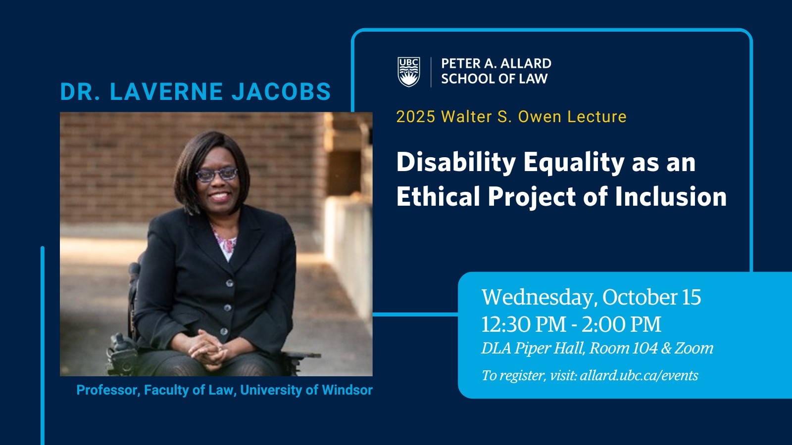 Disability rights law evokes notions of empowerment, recognition and inclusion of persons with disabilities. Yet, at this moment, members of the disability community face significant barriers to achieving equality, especially in relation to accessibility and access to justice. Anchored in a deep and rich history of legal decisions and legislative developments, including in areas such as transportation, access to postsecondary education and procedural accommodations, efforts to achieve disability equality in Canada have had varying levels of success. In this lecture, Professor Laverne Jacobs re-orients the discussion, proposing that many governmental efforts to achieve equality would benefit from centering disability equality not simply as a legal right, but also as an ethical project of inclusion.