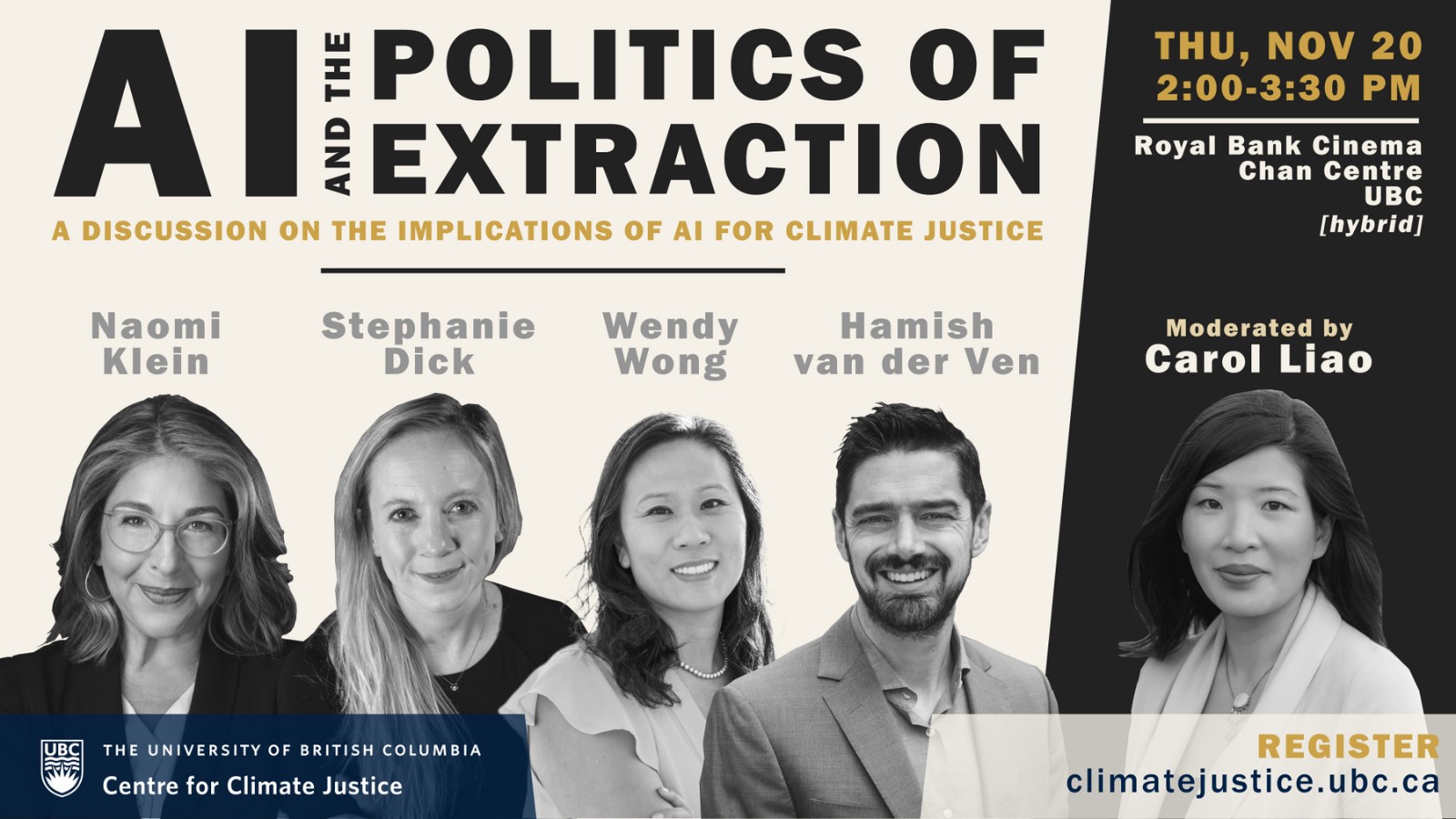 In this public discussion, Professors Naomi Klein (UBC-V), Stephanie Dick (SFU), Wendy Wong (UBC-O) and Hamish van der Ven (UBC-V) will explore questions around the implications of AI for climate justice, the governance of AI and protection of users, and which beneficial models of AI could and should be explored. Moderated by Professor Carol Liao (UBC-V).