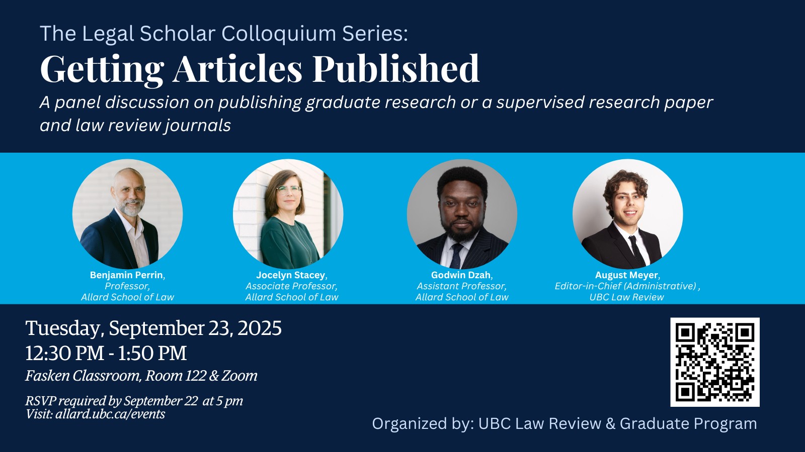 Are you hoping to publish your graduate research or supervised research paper? Are you interested in learning more about law review journals? Join us at 12:30pm on September 23, 2025 in Room 122 or over Zoom for a panel discussion, with Allard Law professors and the editors of the UBC Law Review.