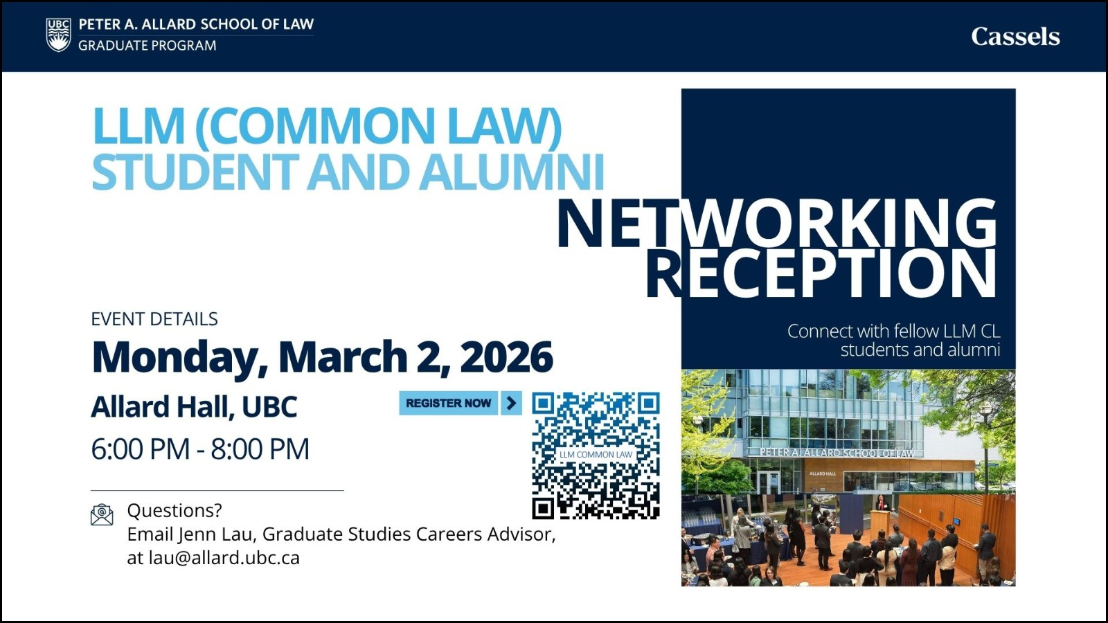 On behalf of Allard Law's Graduate and Professional Programs, please RSVP for a special networking reception open only to Allard LLM Common Law students and LLMCL alumni. (Re)connect at Allard Hall over light appetizers and drinks with your classmates and 15+ years of alumni and program instructors. Space is limited – register early! This reception is being organized by Allard’s Graduate and Professional Programs. Thank you to our sponsor Cassels Brock & Blackwell LLP for the generous financial support of this event.