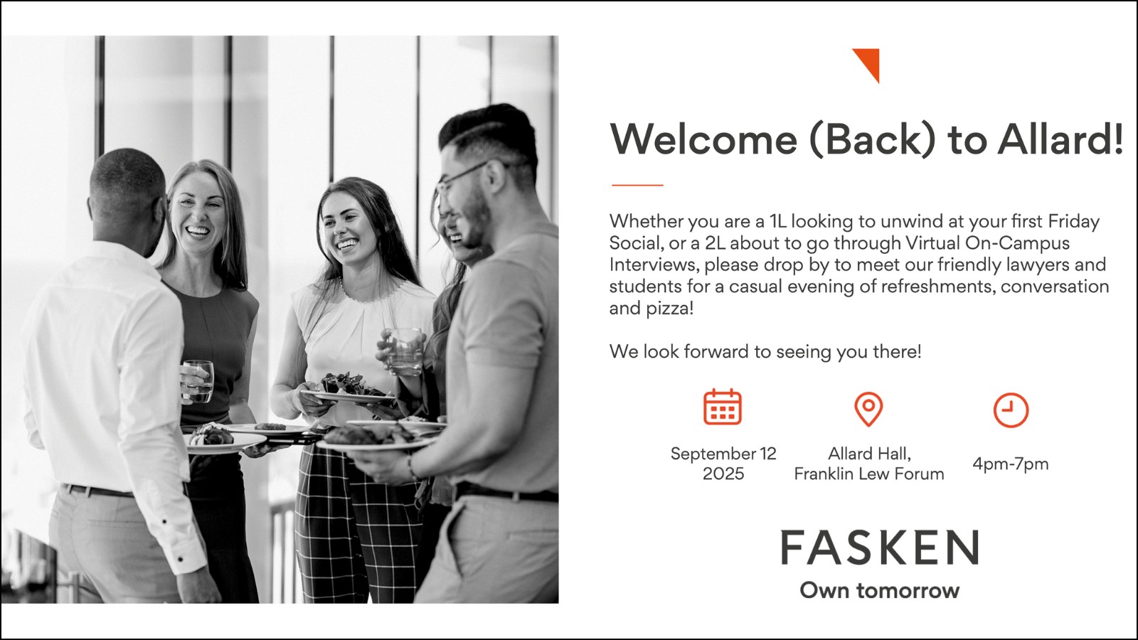 The LSS is pleased to announce our first Friday Social of the new year, generously sponsored by Fasken! Join us on Friday, September 12th, from 4 - 7 p.m. in the Franklin Lew Forum for a fun and casual networking event with Fasken lawyers. Food and drinks will be provided, just come as you are after class and get some insight into what life is like at Fasken! No ticket or sign-up required beforehand, just bring 2 pieces of ID.