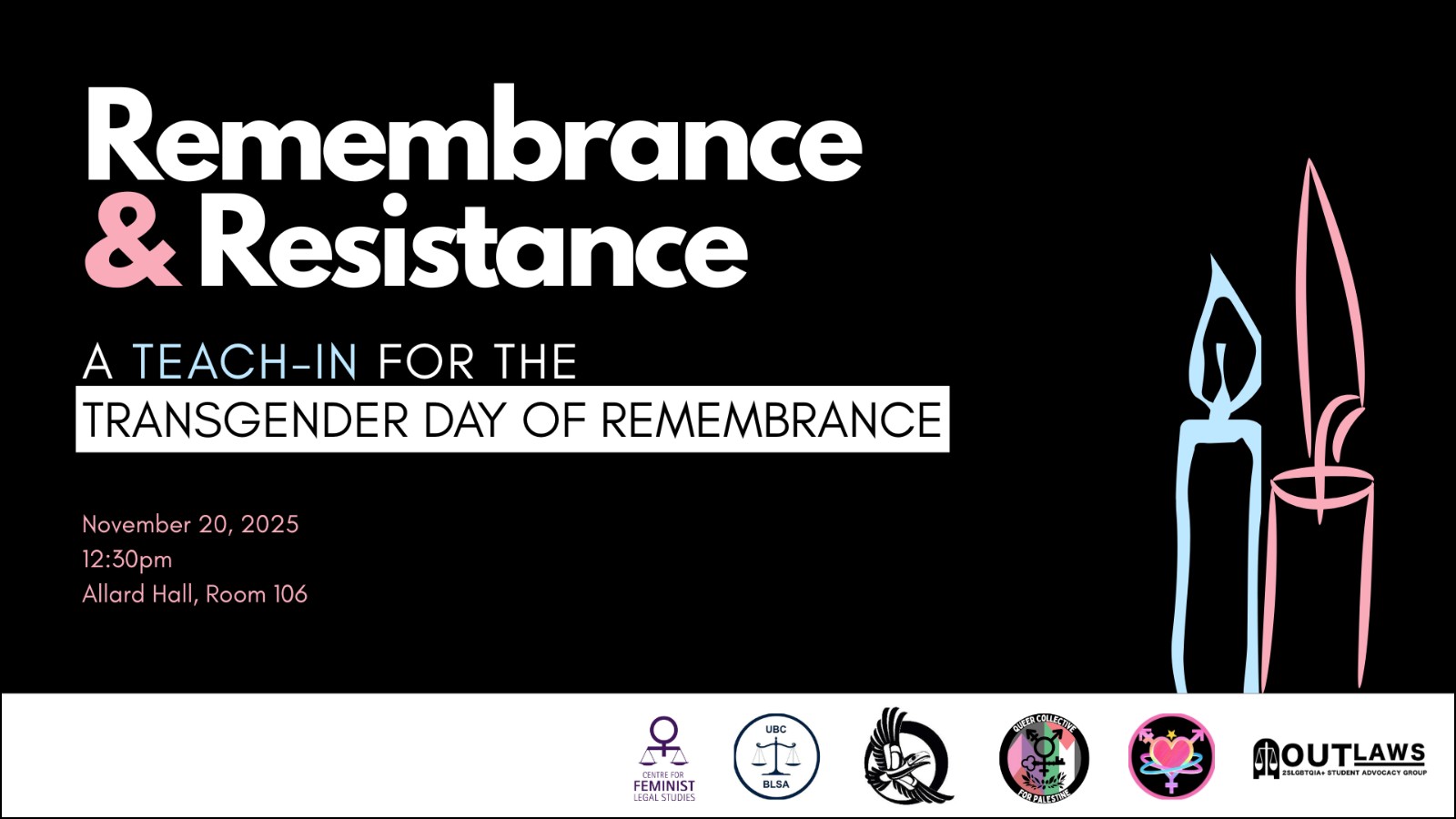 All faculty, staff, students, and UBC community are welcome to join us in solidarity, with love and care. We invite attendees to bring flowers, trans flags, newspaper clippings, or other contributions for the memorial outside Allard Hall.