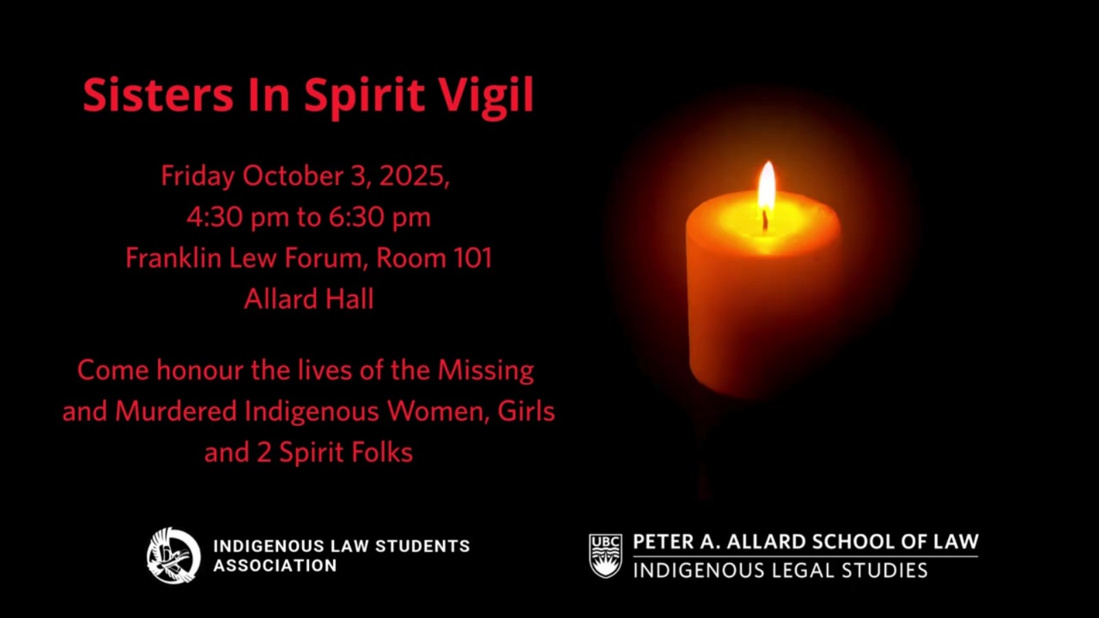 Join the ILSA & ILS in honouring the lives of Missing and Murdered Indigenous Women, Girls, and Two-Spirit individuals. On Friday, October 3rd, from 4:30 to 6:30pm in the Lew Forum, we will hold a candlelight vigil at the reflection pond to remember those lost, support grieving families, and create a space for collective healing. Standing together, we can call for meaningful action and justice on this urgent issue.