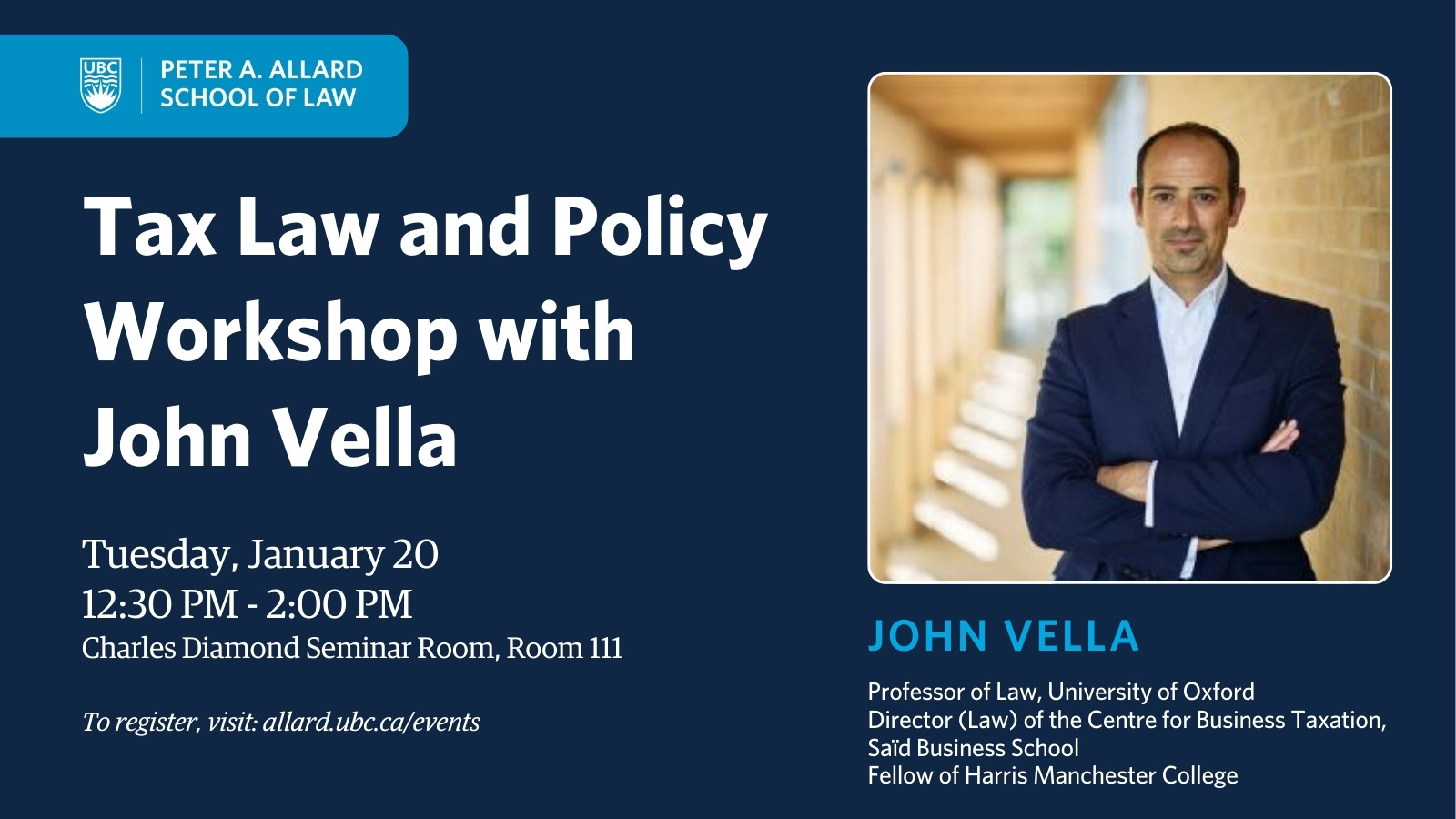 Please join Professor David Duff and John Vella, Oxford University Faculty of Law and Center for Business Taxation on Tues, Jan 20, 2026 from 12:30pm to 2:00pm in Allard Hall, Charles Diamond Seminar Room, Room 111, for lunch and a discussion on tax law and policy.
