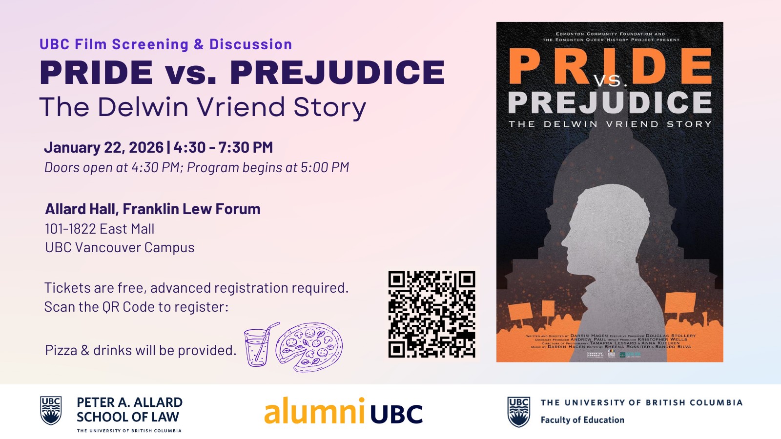 alumni UBC, the UBC Faculty of Education and the Peter A. Allard School of Law invite you to a screening and discussion of Pride Vs. Prejudice: the Delwin Vriend Story. This award-winning documentary traces the development of human rights protections for the 2SLGBTQIA+ community in Canada. While the film presents a piece of legal history, it has become particularly relevant today as legislation is being introduced in a number of jurisdictions to limit the rights of trans youth.
